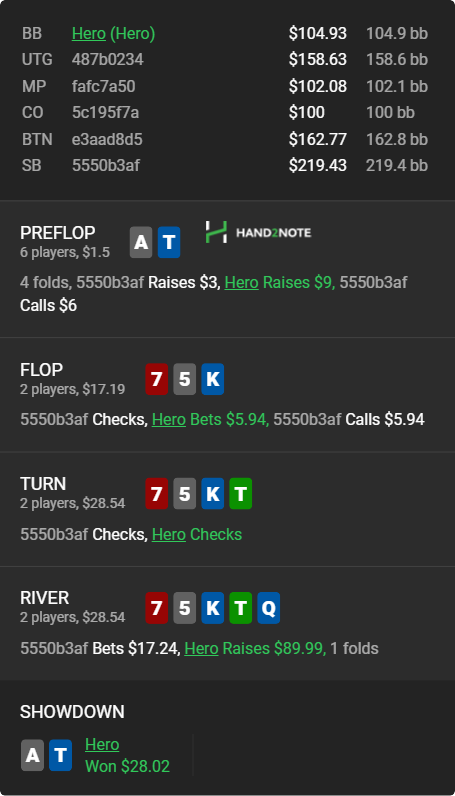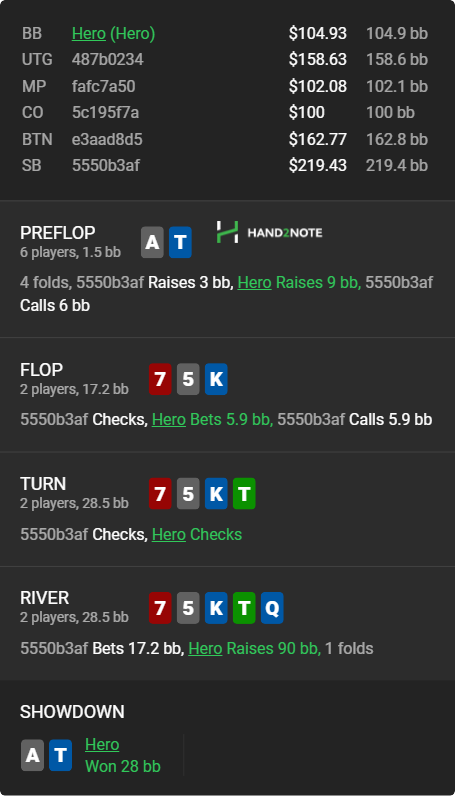 До ривера все стандартно, на ривере все зависит от того, хотим ли мы тут играть сбалансированно или у нас есть причины для эксплойта поляны, раз нет инфы на конкретного игрока. Было сказано, что у SB недостаточно рук для блефа и я с этим полностью не согласен. Да, конечно неготовые бродвейки тут попали в пары и лучше, но у игрока на SB множество А-хай с бэкдорами было с флопа и слабых пар, т.к. хиро поставил всего лишь 1/3, так что потенциальных рук для блефа вполне достаточно. Я выбрал лишь половину А-хай и этого хватило, что бы у АТ было эквити на колл (скрины приложу).