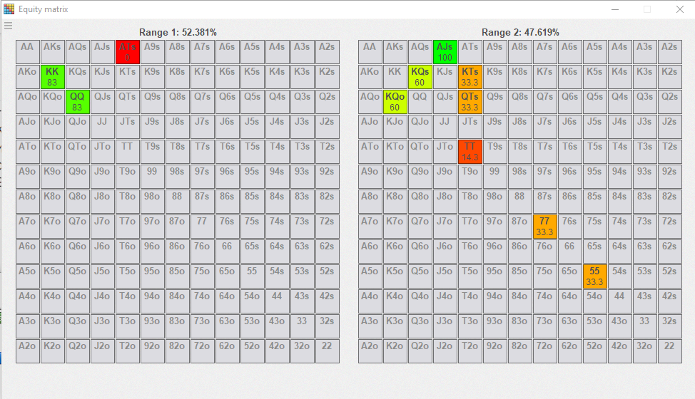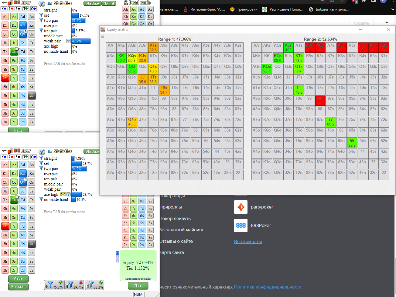 Итак финал ривер, допустим Хиро пушит 9 комбинаций которые я предстаивл, оппонент ставит на ривере 38 комбо. На пуш ему есть смысл коллировать KQ, которая блокирует наш велью диапазон и фолдить сеты, пока так и оставим (в голову неизвестному игроку не полезем), а так же фолд с QT и КТ, по крайней мере эквити этим рукам против нашего ренджа не хватает. Получается, что на пуш он продолжит 12 комбо = 68,4% ФЭ.