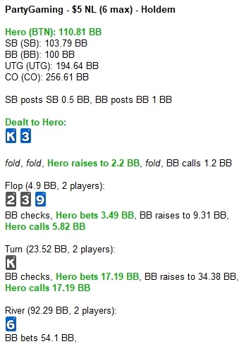 И еще добавлю, что нас на нл500 не так сильно должна смущать 6 по риверу, как на лимитах ниже, т.к. его ГШ, доехавшие в пару могут доблефовываться, хотя этот спот в этом плане и не самый показательный