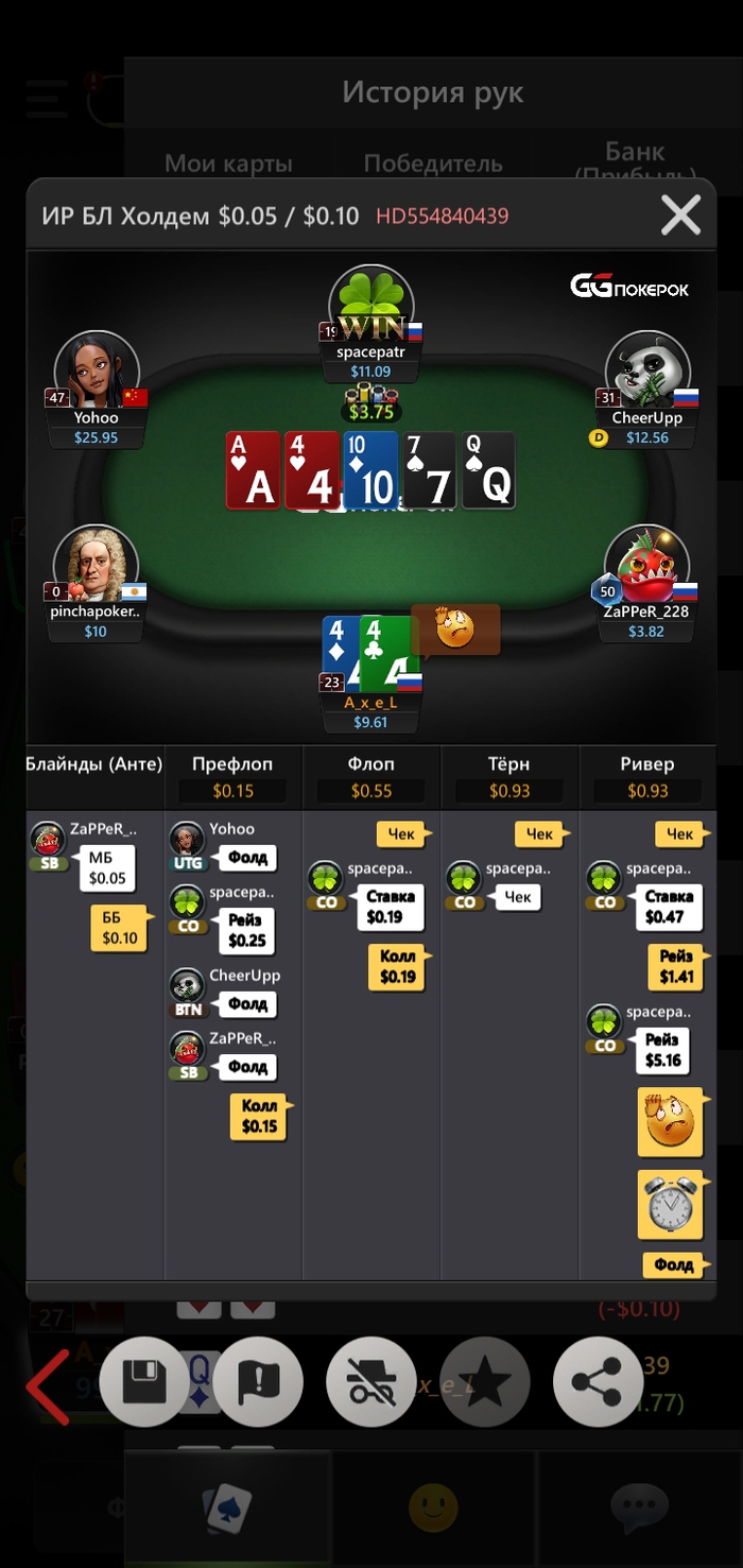 2. Конкретно по данной раздаче. С какими руками хуже, соперник будет рейзить нашу ставку на ривере для велью? АQ я думаю ставить на терне нужно с 100% частотой учитывая динамичную структуру борда, разве что QT, но и с ней лучше сразу уйти в чек тогда с флопа, чем выбивать воздух на флопе и после уходить в чек давая всем дро соперника просто смотреть бесплатный ривер. Но даже если там есть QT, то с каких рук мы соберем велью рейзом? В теории диапазон колла игрока на БТН в этой ситуации это слабенькие Ах, какие то KQ, может QJ (но не точно, тут надо что бы или мы агрессивные были или он телефонил). И учитывая что всех сильных тузов мы 3 бетим префлоп и ставим ривер полярно, то в основном наш велью бет начинается с двух пар по типу 74 (которых всего ничего и с которыми мы вероятно не станем коллировать его рейз). Значит его рейз по риверу с QT будет самоизоляцией и не будет велью рейзом, он просто повыбивает все наши блефы и может 74 и далее упрется в доперы лучше, сеты и стрит. Все верно или я что то упускаю? Просто я на месте соперника тут буду рейзить стрит по KJ если не стал ставить с такой рукой терн и ничего в блеф, пока не увижу высокий показатель бет/фолд ривер. И многие реги местных лимитов будут играть так же, по этому если мы играем бет крупной ставкой в 3/4 пота и после получаем тут рейз, я бы рыл сет 44, другое дело если мы ставим 1/3 пота для тонкого велью со всех Qx и даже Тх комбинаций и провоцируем еще таким образом сделать соперника рейз на широком диапазоне, то тогда изи колл. Но я бы выбрал тут бет крупного размера, да и ты сам так советовал, так что я за бет/фолд ривер, просто в эксплойт среднего рега нл10, а они слишком редко рейзят ривер, тем более крупный бет сайзинг.