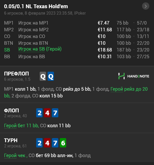 Флоп- четверть пота на низкой доске, где у оппа почти нет натсов, а у нас есть хороший блокер на флаш мне нравится. Диапазон оппа в целом смещён в сторону средней силы рук - оверпары (всё бьём), фд, иногда голые оверкарты, по бэкдору так уж точно. Нас бьёт только сет семерок, крайне редко АА, КК.