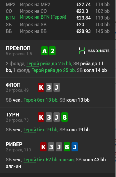 Стоит ли доблефовывать ривер? Тут если брать мой диапозон 4 бета, это самый низ ренджа, остальное куда-то попало. Я доблефовал т.к посчитал что иногда, может не всегда, но он пофолдит KQs. Кроме того далеко не факт что у него AJ есть на ривере и что он их не сфолдил еще на терне.