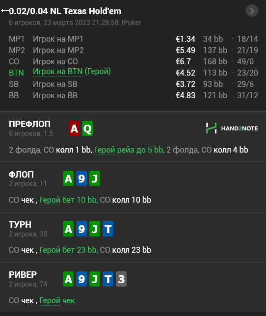 Терн явно не для овербета и как правило мы используем поляризованный бет сайзинг и я думаю AQ тут прям на тоненького, с чего вы взяли что фиш никогда не выбросит тут туза??? Если мы возьмем среднего фиша, то у них достаточно высокие фолды на терне на плотный сайзинг и выкинуть какие ни будь А3 на второй плотный баррель OOP фиш вполне себе может.