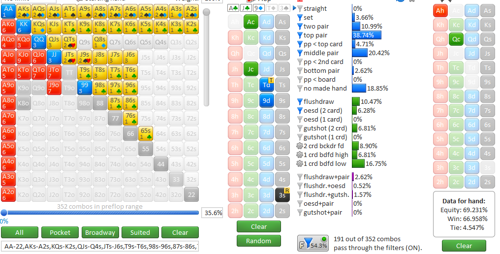 ZMN, можешь пояснить мне за OESD и гатшоты, которые он там тянет, но которых нет на слайде? Это что за комбинации? Какие там ФД я ему выкинул, кроме пары самых мелких? Оставить их, означает, сказать что фиш вообще никогда невыкинет OOP никакое ФД, я бы так делать не стал.