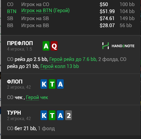 Так что твоя первоночальная линия бет 1/4 флоп, с планом продолжить на турне мне нравиться. Какое никакое эквити у него выбиваем. Есть ауты на натсы. Есть тузы слабее, которые платят 1-2 улицы. Ну и те же редкие, но FD которые он не поставил.