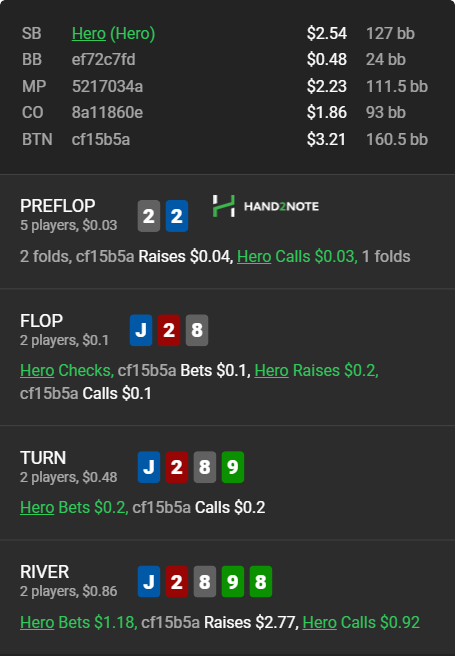 За несколько кругов до раздачи опп лидбетил в мультипоте со слабым тузом на довольно тяжелой доске. Собственно, получив от него ререйз на ривере, Hero снэпколлил, но вопрос есть ли здесь фолд? Или все же всегда придется отдать свой стэк?