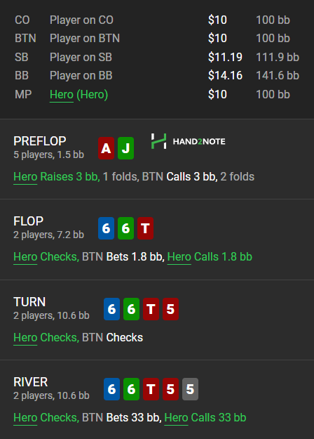 Ривер: Что касается ривера, размер конский канечно,но линия очень слабая.Блефов много можно придумать.Дорогой сайз но для дальнейшей с ним игры,я бы вскрыл, все равно для информации,чтобы в следующий раз тебе проще было с ним играть и у тебя понимание было,что он может делать.Но Фолд тоже не ошибка,так как мертвых денег совсем немного.