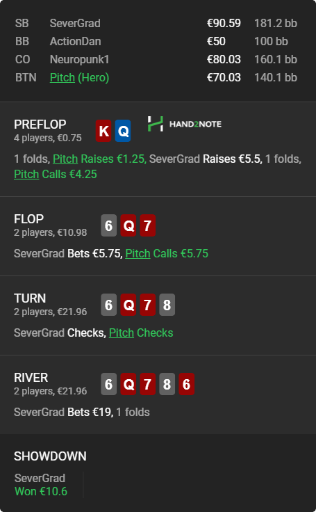 В этой раздаче KQo блеф-кетчером не является, но выполняет роль блеф-кетчера. Да и вообще понятие блеф-кетч в сегодняшнем покере практически не актуально, слишком много играют на ривере мерджа и тонкого велью.