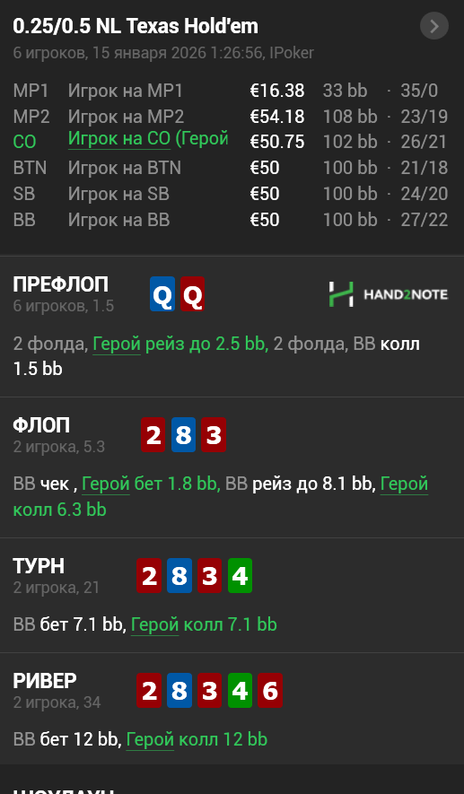 В целом раздачу разобрал, колл по риверу считаю грубой ошибкой. В момент раздачи был не в фокусе в момент сессии, хорошо это помню.