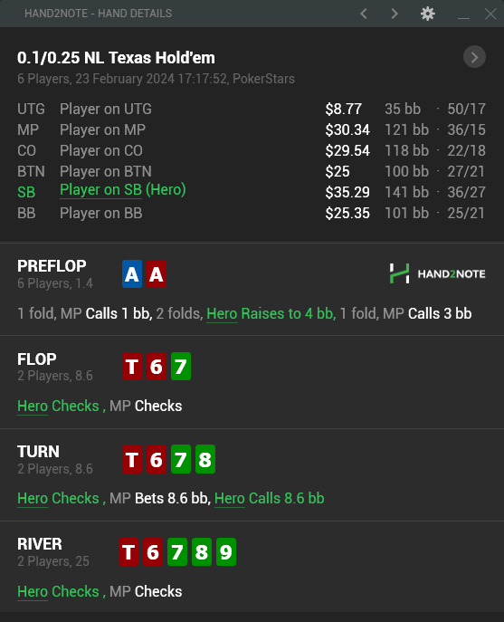 у тебя есть железобетонный велью бет против любителя, а значит нужно ставить крупно и продолжать в бланки. Получили плохой ран - никто не запрещает сыграть чек и дальше смотреть по ситуации и на крупные сайзинги выкидывать, а плохой ран для тебя тут будет только 4 стрит.