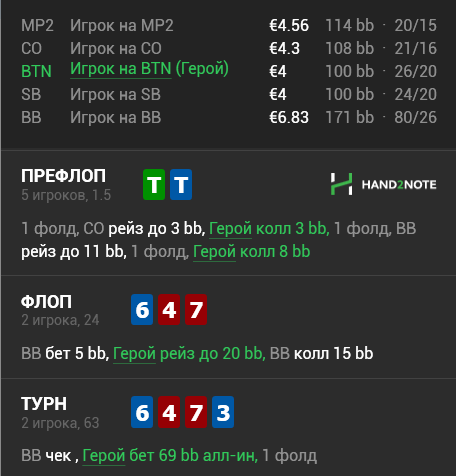 2) Ты хочешь на микросах затолкаться с ТТ на префлопе, против нита на СО? Или ты про колл/4 бет? Если бы я был уверен в его широких 3 бетах, то можно было еще "потолкаться", но тут не простая ситуация и есть позиция, думаю постфлоп у меня будет преимущество в скилле и достаточно вариаций для маневра при таком SPR в позиции.