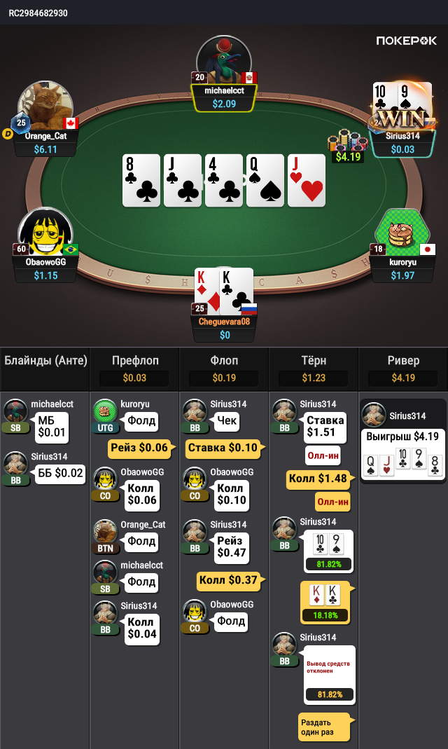 Тёрн. Оппонент сам ставит овербет и идёт олл-ин. И это после ре-рейза на флопе, когда на столе лежат ФД и СД. Я бы тут однозначно фолдил. И если бы были не КК, а АА, то тоже бы фолдил - слишком мало комбинаций из такой линии оппонента бьют эти руки. Даже с рукой