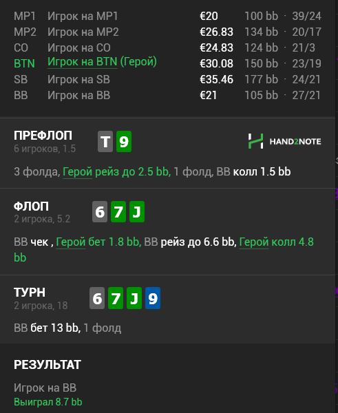 Против агрессивных соперников мы конечно не будем рендж бетить, но поставить тут 50% рук или около того будет абсолютно нормально. Рука Хиро может играться как ставкой, так и чеком. Но если мы поставили, то фолда не на флопе, не на терне быть не может, даже при условии, что мы практически всегда сдадимся на третий баррель. Это абсолютно нормально, что часть диапазона мы выкидываем на рейз флопа, часть на бет терна и часть на ставку ривера. Если наш диапазон в целом не провисает по защите, то ничего агро рег поделать с этим особо не сможет.