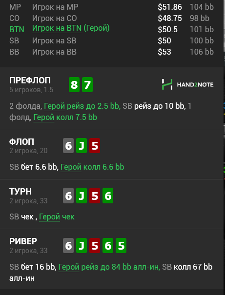 По риверу поймали свой флеш и получили ставку в 1/2 пота и кроме колла я тут не вижу функций. Для пуша нам нужен хороший фиш вместо рега