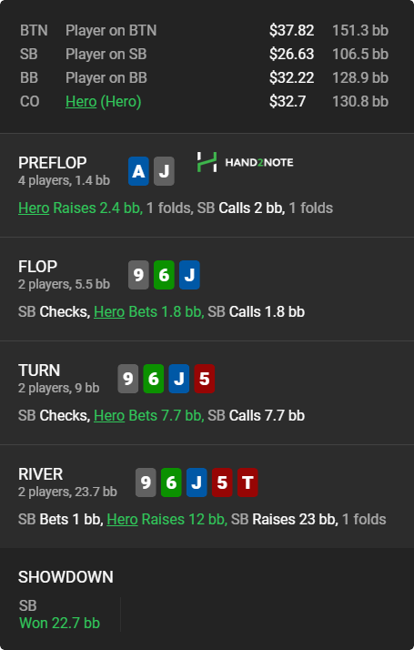 Противник фиш, вроде как агрессивный, статов на него было мало, но играл активно и видел от него блефы (правда недорогие). Что делаем на ривере? Будь он пассивным я бы точно добирал сайзингом 33% с любого попадания. А против агрессивного насколько тонко мы можем вэльюбетить? Что делать с его рейзами?