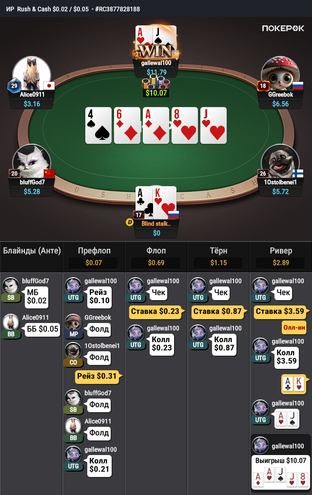 Приветствую, моё мнение рука не переигранна и все хорошо, что усилил J на ривере? JJ фолдят уже край на терне, AJ как правило защищаются только мастевые, а это всего одна комба . Какие еще руки бьют Хиро? Можно представить слоуплей сета, но мало вероятно, при этом 4 комбы AQ есть и какие то АT. Все кто пишут "мы тут пушем выбиваем все однопарные руки" (а это 90-95% диапазона) повидимому всегда блефуют на 3 улицы на А-хай бордах, причем доезд в J тоже пуш, с какими нибудь KJ, ведь при таких раскладах EV пуша будет выше, чека... Не рассказывайте мне сказки. Вы и близко так не блефуете и боитесь, что вас вскроют по тузу, но когда у вас велью, так все сразу упадут.