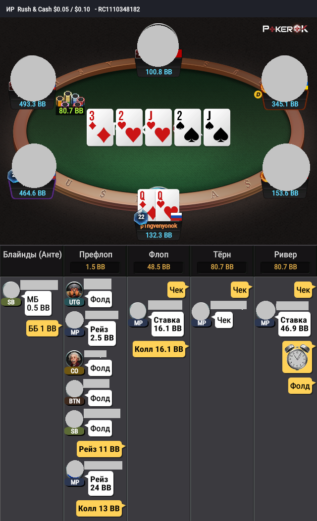 ТУРН: Чекнул вдогонку, я не понимаю, нормально это или нет. Вроде обычно с вэлью редко чекают в 4бете турн, поэтому склоняюсь к тому, что у него какой-то блеф.
