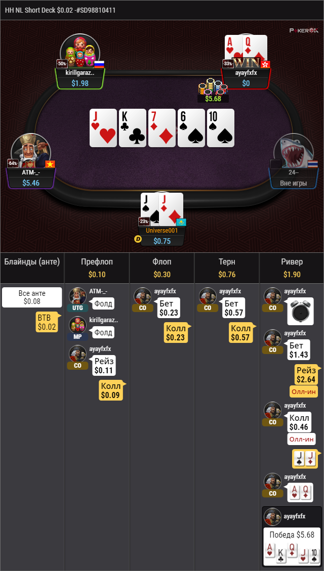 Но помните! В отличие от обычного техасского холдема, в холдеме 6+ флеш старше фул-хауса. Пятикарточная комбинация, включающая в себя туз, 6, 7, 8, 9 (любой масти), считается стритом. Других отличий в старшинстве комбинаций нет.