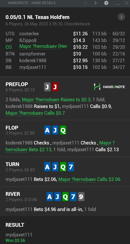 На флопе хороший крупный флоат. СБ после его чека мы всегда бьём, на ББ нас иногда могут побить QQ, но от них я бы ожидал экшена сразу, поэтому после колла у нас старшая рука