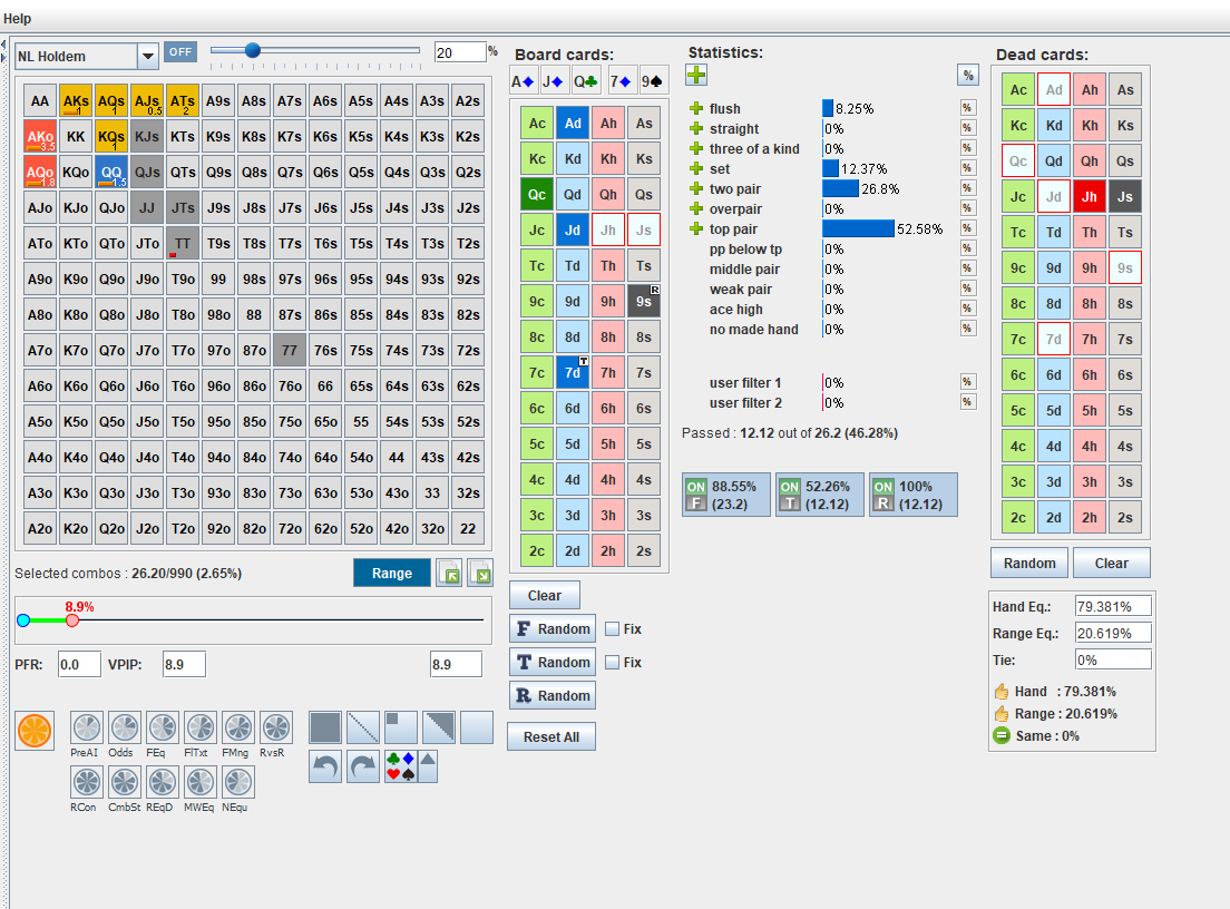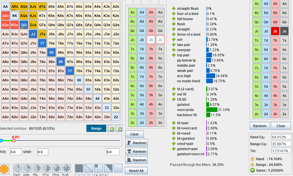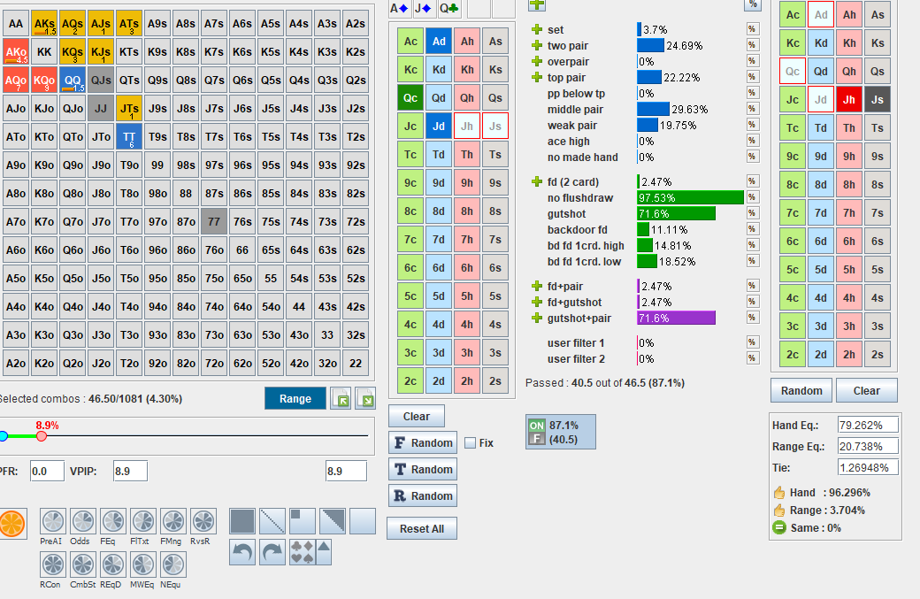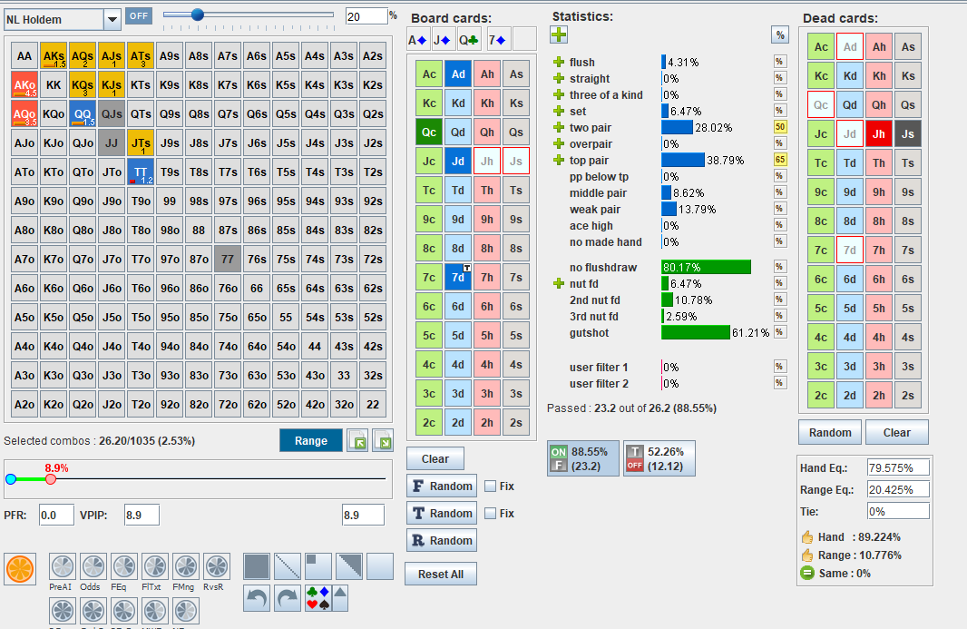 2. Думаю кроме пункта #1 еще есть неточности в задании спектра, а точнее он больше будет делать 3Bet с руками типа KTs, QTs, A9s с какой-то частотой, а не с 88,77.