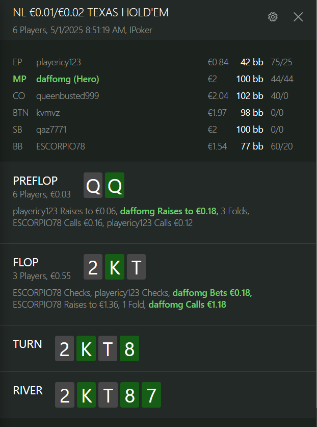 думаю бет в двоих здесь вникуда вообще, без ФЕ, у нас был хороший стартер, мы хорошо сыграли префлоп, вышла такая доска, ну ничего страшного бывает, не повезло, стараемся максимально дешево доползти до ШД, сила нашей руки к Риверу уже врятли измениться оносительно оппонентов, совсем ненужный спот