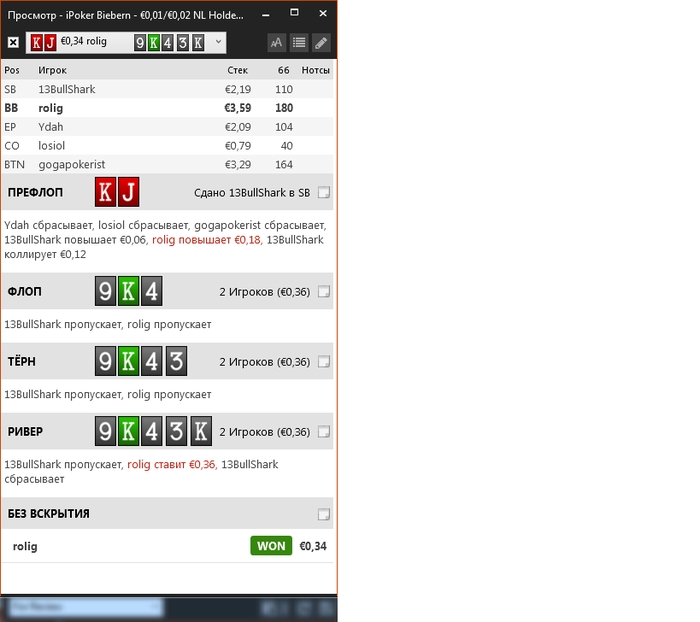 Kenshin, понял. Сам поспешил, не разобрался, подумал что хиро на ББ (раз жирным выделен), соответственно сделал неправильные выводы. Только учусь разбирать раздачи, поэтому строго не судите (тоже не ставьте сразу "минусы"), объясните подробно, чтобы стало понятно. Возвращаю "плюсики"))