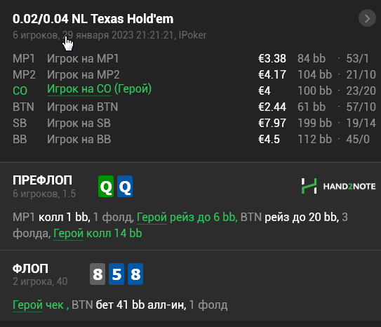 Префлоп: изолейчу ВИПа, однако получаю 3 бет от другого ВИПа, по динамике было видно, что он предпочитает входить в игру коллами и лимпами и в целом вел себя довольно таки пассивно, подумав, что QQ слишком сильные на данном этапе, чтобы просто выкинуть решаю коллить, хотя и понимаю, что диапозон 3 бета очень узок, тем более на мой изолейт