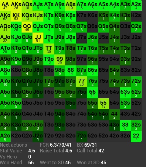 Если он 3бетит только АК,КК+, то твой пуш на префлопе будет иметь -8бб ЕВ с учетом рейка 5%, если добавишь ему еще JJ+, то уже он будет слабо плюсовой, если же он 3бетит 5%, то уже ЕВ пуша 12бб. На основании чего ты сделал вывод о том, что у оппа 2% рейндж 3бета? Если на основании стата, то слишком маленькая выборка - на 100 рук возможностей для 3бета у оппа должно быть около 20, если у него реальный 3бет 5%, то с вероятностью 35% на этой выборке он вообще ниразу не 3бетнет. Если ты сделал такой вывод просто на основании статов - 57/10, то тоже напрасно - я вот сделал рисерч по людям с ВПИПом 50-80 и ПФР 7-15, у них 3бет изолейта в среднем 4,6%, причем там такая ересь бывает (картинку прикрепил), и они потом из этого ничего не фолдят почти.
