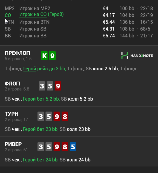 Префлоп, открываюсь с K9s на CO, возможно под ВИПа нужно было сайз побольше открытия.