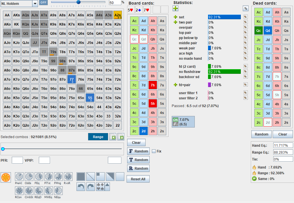 Эквити хиро против общего спектра - 87% и есть ставка на тонкое. На мокрой доске ставить нужно минимум 2\3 пота,а лучше 3\4. Хиро ставит 15 бб и получает рейз - 34 бб. Против спектра рейза наша рука имеет 7 % велью и нужно фолдить.