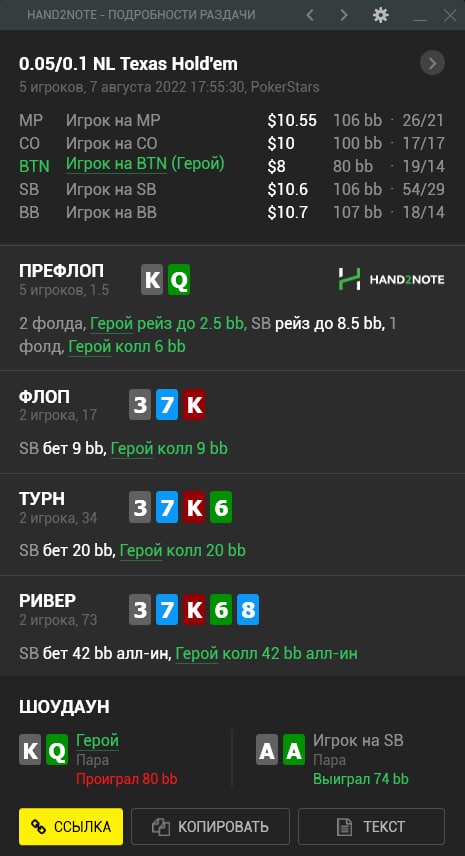 В примере у тебя оп 54/29, т.е. скорее всего агро макака. И у такого тут 3Бет будет явно не 5%, так что кол префлоп годится. НУ и если он на постфлопе такой же агро, то кол 3х улиц нормально. Но опять же, если вдруг у него 3Бет узкий, то кол префлоп уже не очень. Или если он не ставит по всем трем улицам довольно агрессивно, то ривер уже можно падать.