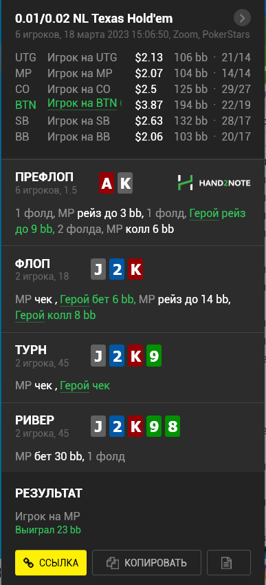 ПРЕФЛОП: Хороший 3бет, однако сайз тут не нужен стандартный. Против нас слабый оппонент и стоит накинуть 1-2бб, так как это никак не повлияет на его диапазон колла. И говоря про накинем, я имею в виду со всем диапазоном, а не отдельную руку подороже.