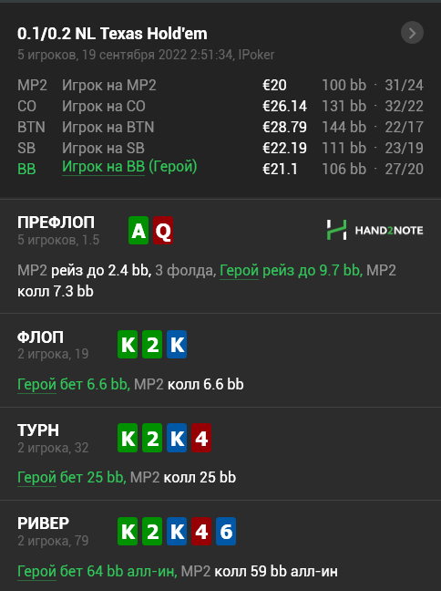 Вывод: префлоп, флоп и терн нормально сыграно, ривер по оппоненту, если нет по нему нормальной информации (как в данном случае), лучше выбирать AQ в блеф без крестовых карт.