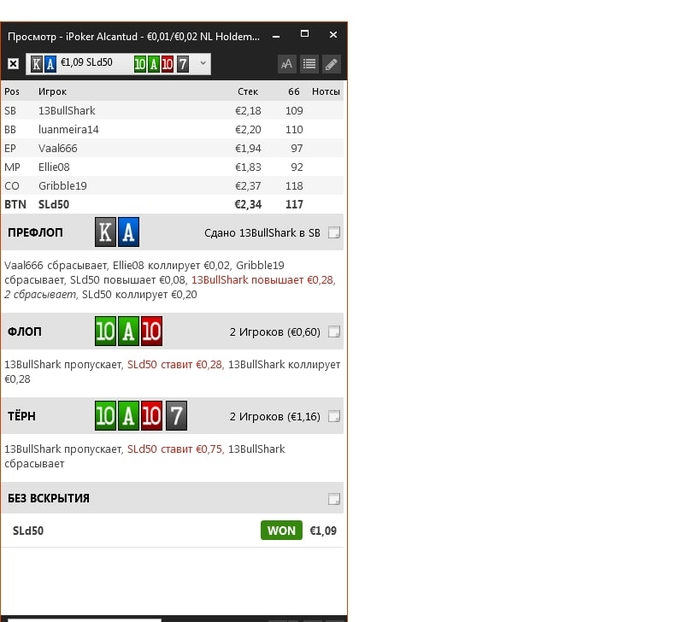 Ну а ривер уже более дефолтно будет сфолдить, т.к. блефы обычно просто отчекают, Ах тоже, а запихают Тх
