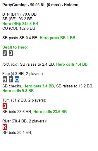 А вот ривер один их худших, потому что дров без попадания почти не остатется, а значит в ставке оппонента зачастую будет сильный недоблеф, потому что на этих лимитах игроки не умеют превращать в таких ситуациях слабое ШД велью в блеф. То, что соперник не в пушил, не показывает, что у него нет руки с которой стоило бы пушить, просто такой лимит. Это может быть как рука с которой он боится пушить, по типу QT (но он её все равно не сфолдит на рейз), либо он занимается "цыганством" с сильной велью рукой, потому что просто боится что мы будем фолдить. По этому по риверу кроме фолда вариантов не вижу.