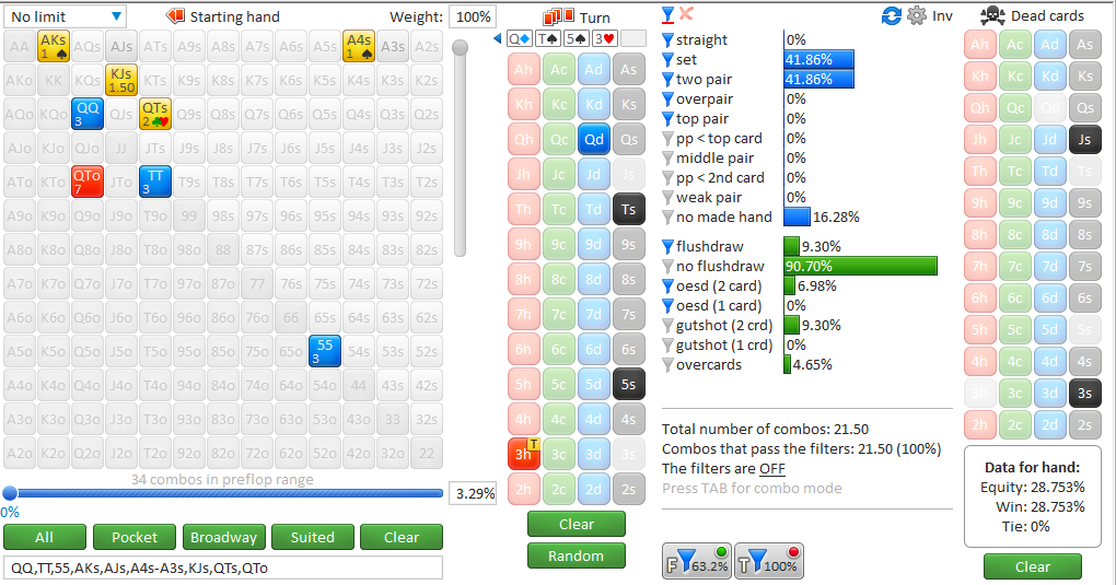 Далее на терне у нас часто есть прямые шансы банка по этому фолд не вариант, я оставил сопернику все возможные допер+ и малое кол-во дров и все равно шансы банка показывают мне что фолд ошибка, на деле у соперника будет меньше велью рук по причине, что с некоторыми из них он будет играть контбет и наше эквити возрастет(приложу слайд). К вопросу пуша, думаю у нас будет крайне мало ФЭ и поедем мы прилично позади, по этому для меня тут один вариант розыгрыша, это колл.