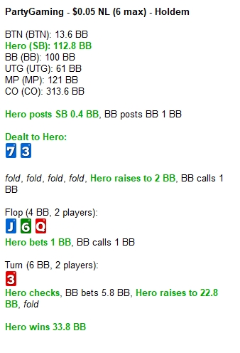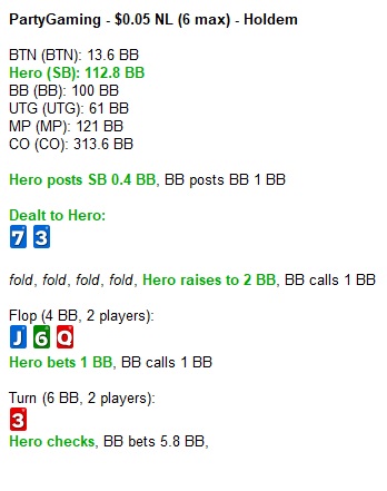 Как правило в бвб на микролимитах регуляры не особо отдают отчёт размеру бета на ПФ (3бетить твой мин бет с Kxs они не будут). Исходя из этой информации, коллу ещё одного мин бета на флопе и пот бету тёрна уверен, что у оппонента есть все БД ФД до включительно и НИКОГДА не будет дамы и вальта (дама очень часто будет уводиться в рейз флопе), а валет просто чекаться до потери пульса.