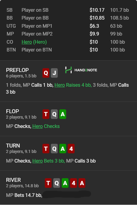 Ривер. Судя по ставке, вот и доехало(( хоть ФД по каким-то коннекторам, хоть море Ax. Иными словами, со своей дамой хиро не бьёт вообще ничего, с чем бы потенциально оппонент мог так играть. Поэтому выбросил бы без долгих раздумий.