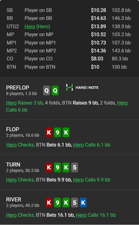 Никакой границы ТАГа тут и близко нет и это очень пассивный опп, ко всему прочему с очень узким 3бетом и против него у тебя уже колл на ПФ пограничный, колл на флопе пограничный и просто инста фолд на турне.