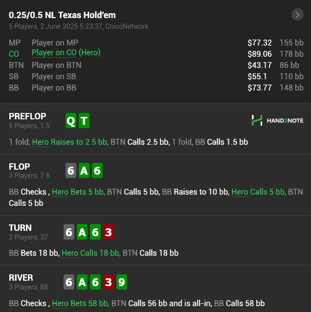 Дальше вроде можно начать придумывать фолд на турне, но его там нет, а на ривере достаточно легкий пуш, поэтому куллер.