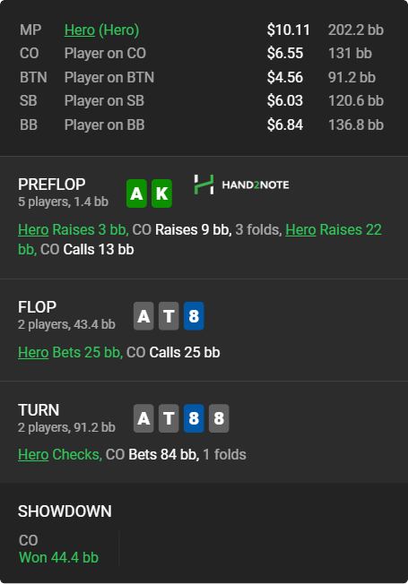 Почему-то чекнул на терне ... и не смог найти кнопку колл против нитоватого оппонента. Ведь выходит, я ничего не бью, а могу лишь делить банк с его АК. Надо было самому пушить на терне? Потом глянул, к оппа фолд на 4-бет лишь 36%..