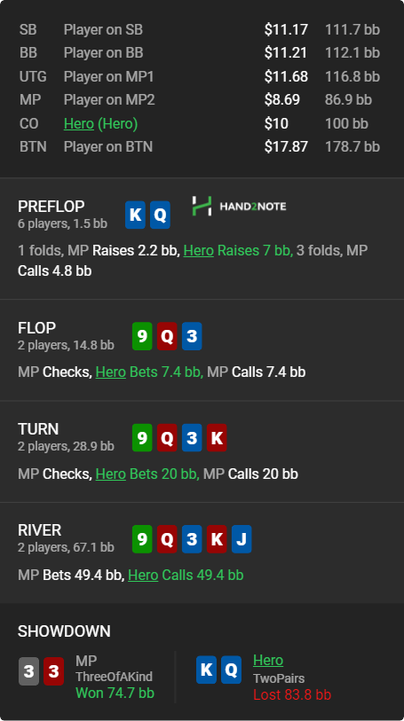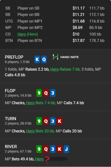Стандартно разыграл 3-бет пот против агро-любителя, но на ривере столкнулся с донк-пушем на пол-стека. Можно ли верить этой вроде бы правдоподобной его линии, где возможен однокарточный стрит через десятку? Закрывая глаза на его пере-агренную статистику на ривере.