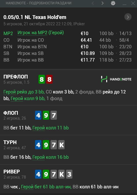 Мы открываемся с MP с рукой 88 стандартным сайзингом 3бб, нас коллирует фиш на CO, BU и SB фолд, рег на BB 3бет сквиз 12бб. Сайзинг для сквиза маловат, мы нажимаем колл согласно префлоп модели, фиш фолд.