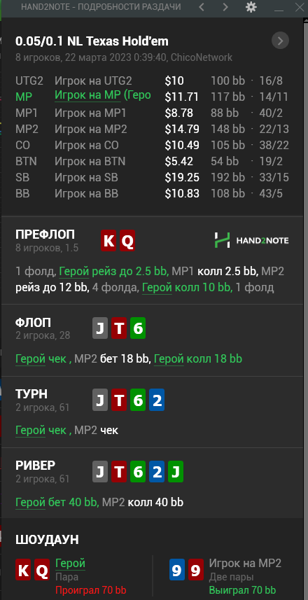 Ривер - Опп капнулся на терне,и у нас нет иного выбора, кроме как блефовать чтобы попытаться выбить А-хай, т.к. у нас нулевое ШДВ (лучший вариант - дележка). Но о каких валетах ты пишешь? на KJ QJ тебя не часто положат, их вообще не должно тут оказаться AJs- да, соглашусь, бывает. но это всего 2 комбы.Сеты ривер порезал, АТ так не играют, QQ тоже редко а вот на какие- нибудь АК-AQ вполне могут.