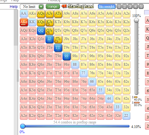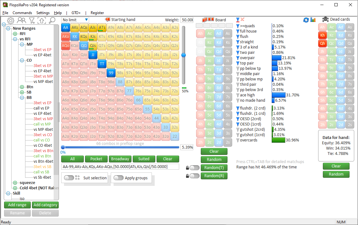 ПРЕФЛОП: Лучше открывать крупнее в районе 4бб и особенно имея фиша сразу же за собой. Ширину диапазона можно несколько снизить. Дело в том, что слишком часто буду происходит коллы от него и плодиться мультипоты. А в мультипотах у нас падает существенно ожидание с фиша, и лишние разы платим рейк. А кроме фиша сразу за нами, есть ещё на ББ и ещё 2 мутных оппонента на СО и СБ. Что ожднозначно будет плодить мультипоты.