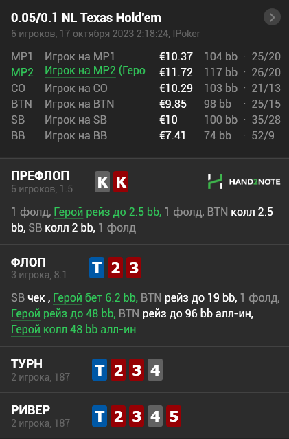 Когда после такой большой ставки получаем рейз, то против чела со средней агрессией ни о каком 3бете и мысли быть не должно. Просто играем колл и дальше смотрим по ранаутам и сайзингу. Обычно это будет максимум колл ещё одной улицы с надеждой на чекбэк ривера
