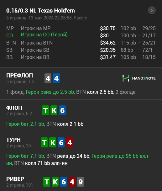 По терну доезжаю в сет, ставлю 2/3 и получаю рейз. Какие руки я закладываю в рейз: сети ТТ-2 комби(частично 3бетит),66-3 комбы, допер КТs-3 комбы,AQs,AJs,QJs,возможно руки А6s. Сети часто бы должны рейзить флоп так как борд дровяной. Вопрос что делать на рейз. Можно здесь перекрутить и запушить, чтобы собрать еще с доперов которые при выходе A, Q, J уже ривер не проплатят и дро рук. Или кол терн и фолд ривер, так как по риверу дрова не будет такой оппонент допушивать только сети.