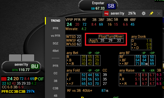 да не заметил что статистика по статнейму и у меня в хаде отличается, то что агрессия по улицам флоп-35,терн-29, ривер-33 это больше к пассивному. А причем колл на БТН к агрессии не совсем понимаю?