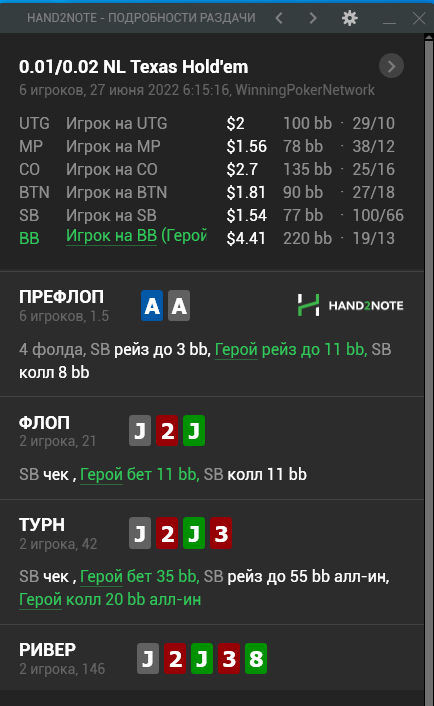 вообще на оппа всего 34 руки но впип/пфр/3бет 99/65/0до этого оп мне отдал стек сыграв топ пару средний кикер в 3 бет банке чек пушем