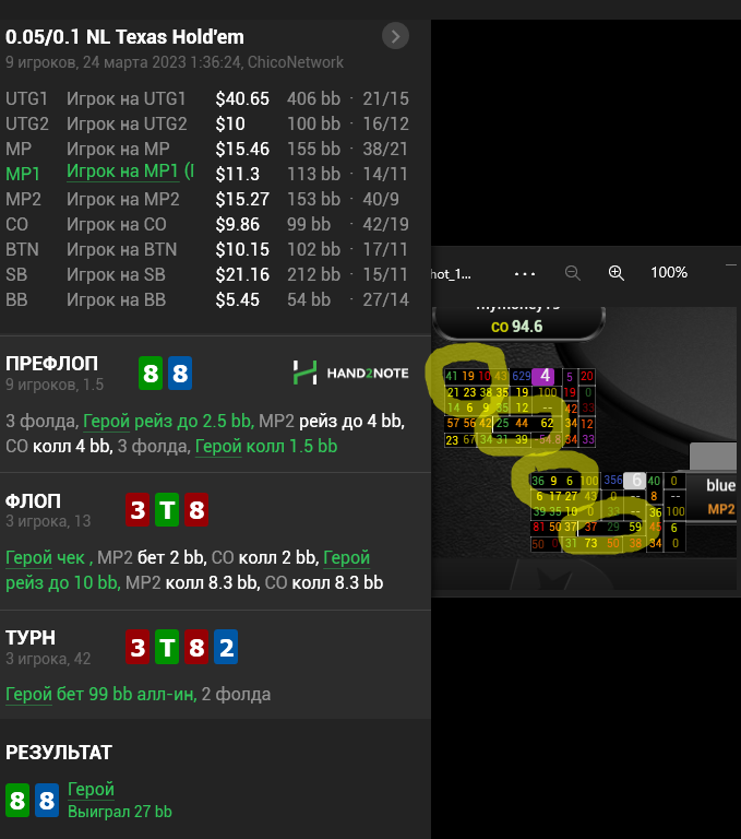 Как лучше сыграть данный спот? В верхней части хада VPIP PFR 3b , внизу фолд на бет по улицам. У МР2 бет на пропущенную ставку 81%, был план играть чек-рейз.